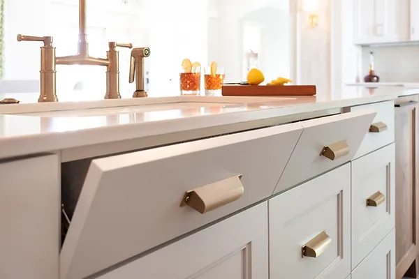 Customized doors and drawers accommodated integrated storage solutions that maintained a consistent visual appearance. Attaching furniture feet to the paneled dishwasher meant they had to be custom-cut to allow for the door to open properly.